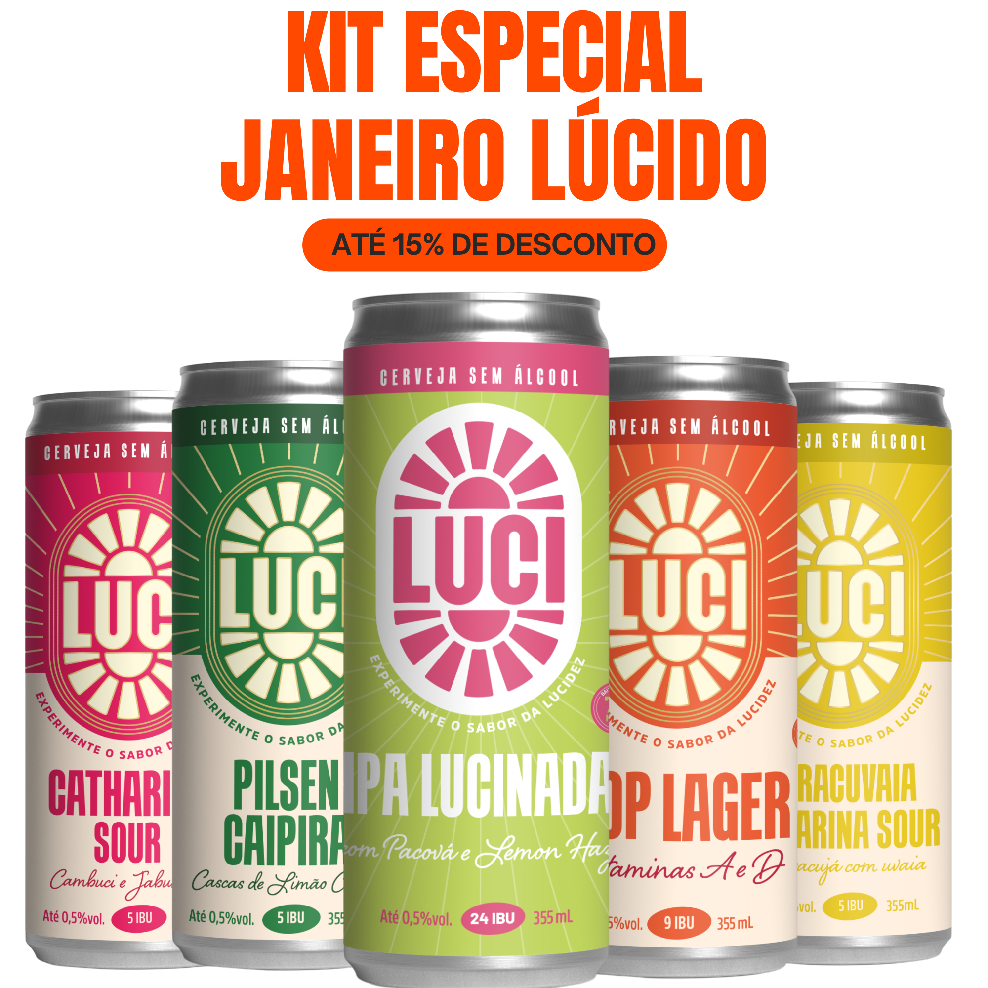 Kit Janeiro Lúcido: escolha as suas cervejas sem álcool preferidas da Luci e ganhe um desconto progressivo para você ter um mês inteiro de muita lucidez. Quanto mais você leva, maior o benefício aplicado automaticamente no carrinho: adicionou, o preço cai, simples assim.